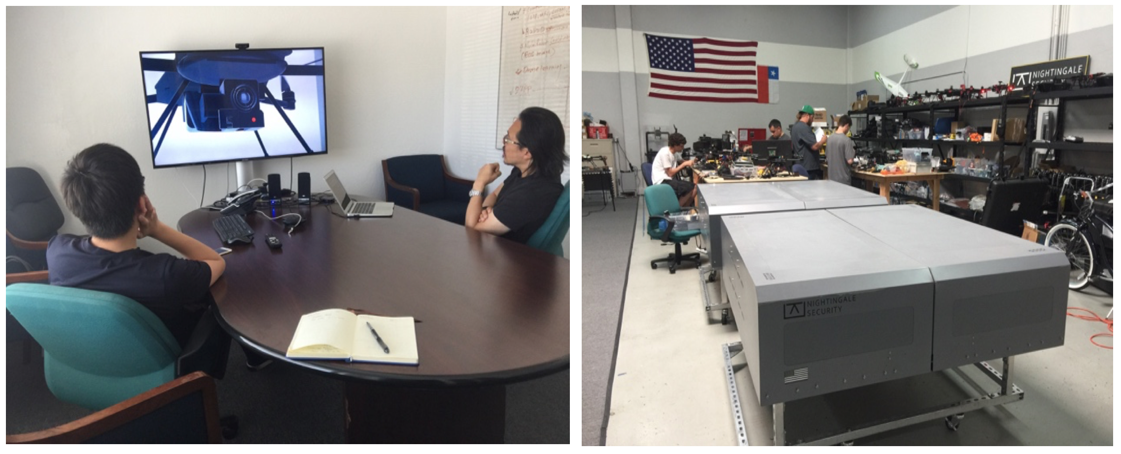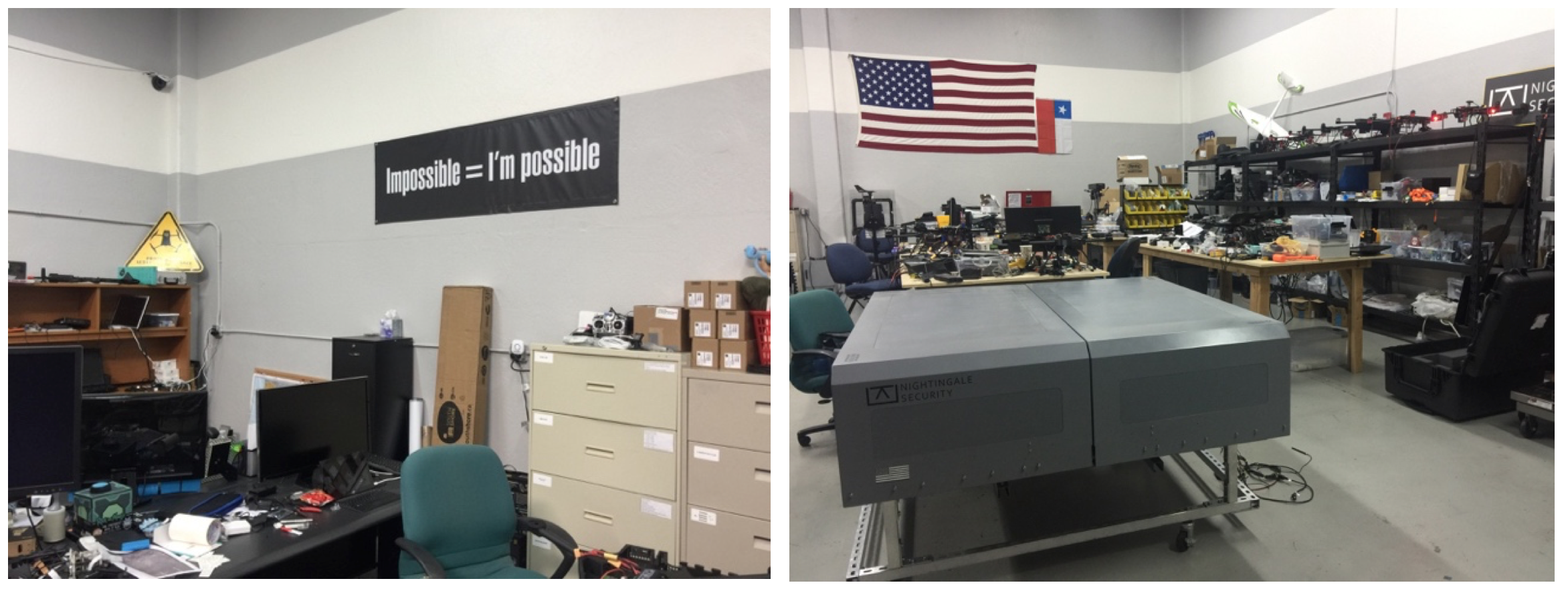 走进Nightingale,马上映入眼帘的就是两个巨大的Nightingale无人机的“鸟巢”(birdnest)(图2)。这两个“鸟巢”不仅仅可以提供对无人机的保护和充电,还可以作为一个小型数据处理器,实时处理无人机巡航时获得的数据。由于Nightingale Security的科技以及商业模式比较新颖,对传统的安防行业有较大的颠覆性,所以在市场开拓上需要大量的现场演示。他们的路演有实地或远程两种。对于硅谷的许多科技客户,他们可以在公司附近的无人机爱好者聚集地Bayland Park现场演示,而有时候要面向美国东部地区以及欧洲的客户进行远程演示,由于时差的关系,团队经常要半夜执行演示任务。团队的人员经常自嘲说加入Nightingale团队的一个好处,就是经常能看到硅谷的日出,而且无人机在空中拍到的蒙蒙亮的天际线,更是平常人所不能看到的。有一次,美国的一家航天公司对Nightingale的产品有兴趣,并要求团队前往远在佛罗里达发射中心的进行现场演示。团队在考虑了诸多的运输办法之后,决定租一辆汽车与拖车拉上整套设备开往佛罗里达。3个员工花了两天半时间从加州开到佛州,顺利完成了演示,然后在开回加州的路上,又沿路在德州,亚利桑那州给另外几个客户做了演示。这可以说是真正意义的项目路演。